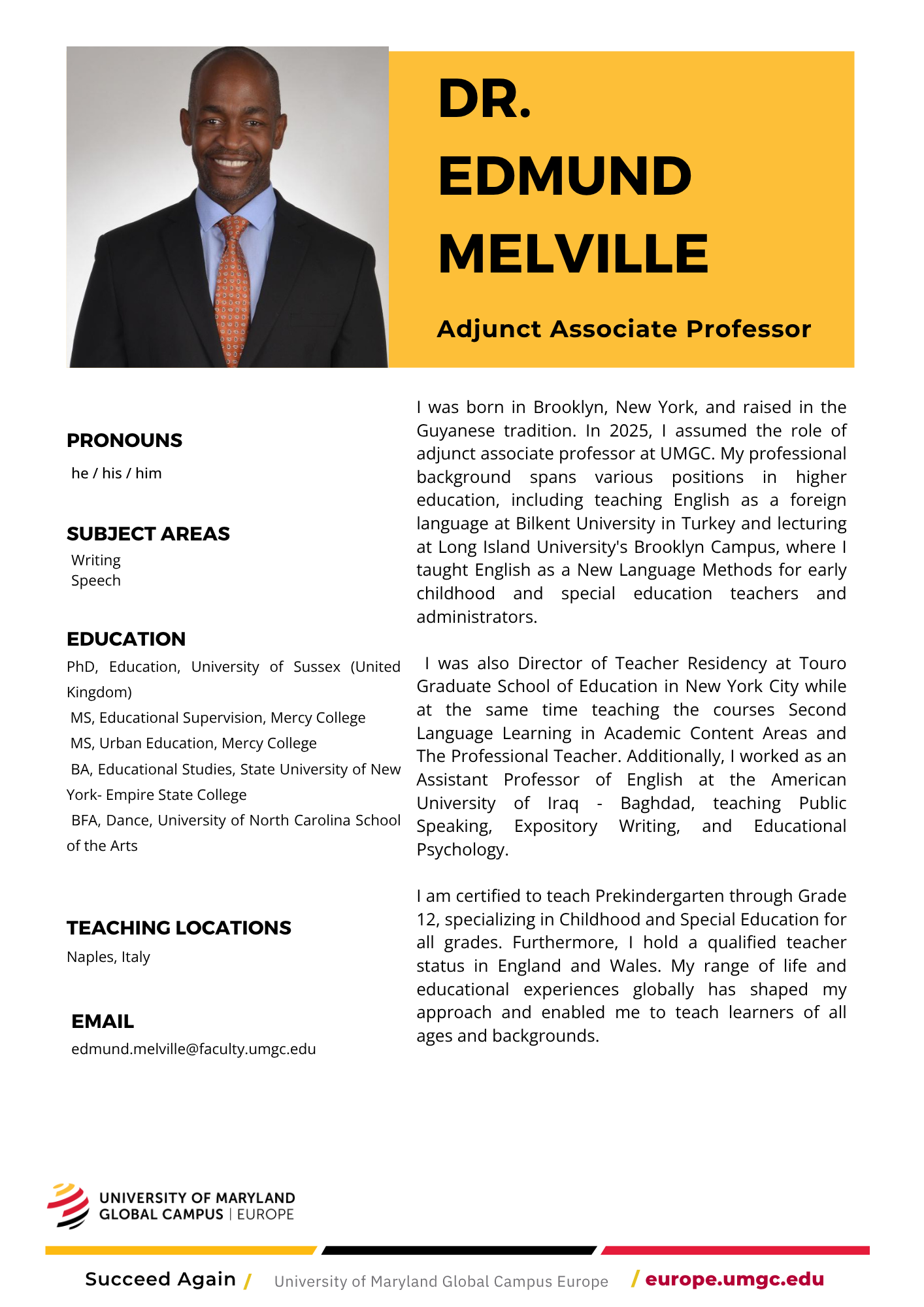 I was born in Brooklyn, New York, and raised in the Guyanese tradition. In 2025, I assumed the role of adjunct associate professor at UMGC. My professional background spans various positions in higher education, including teaching English as a foreign language at Bilkent University in Turkey and lecturing at Long Island University's Brooklyn Campus, where I taught English as a New Language Methods for early childhood and special education teachers and administrators.